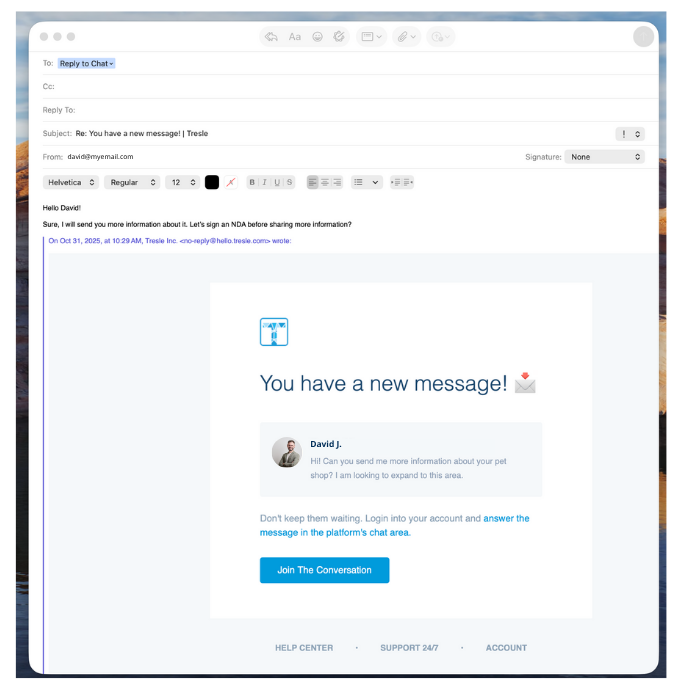 You can reply directly from your inbox, and your message will instantly appear in the chat within your Tresle Message Center.